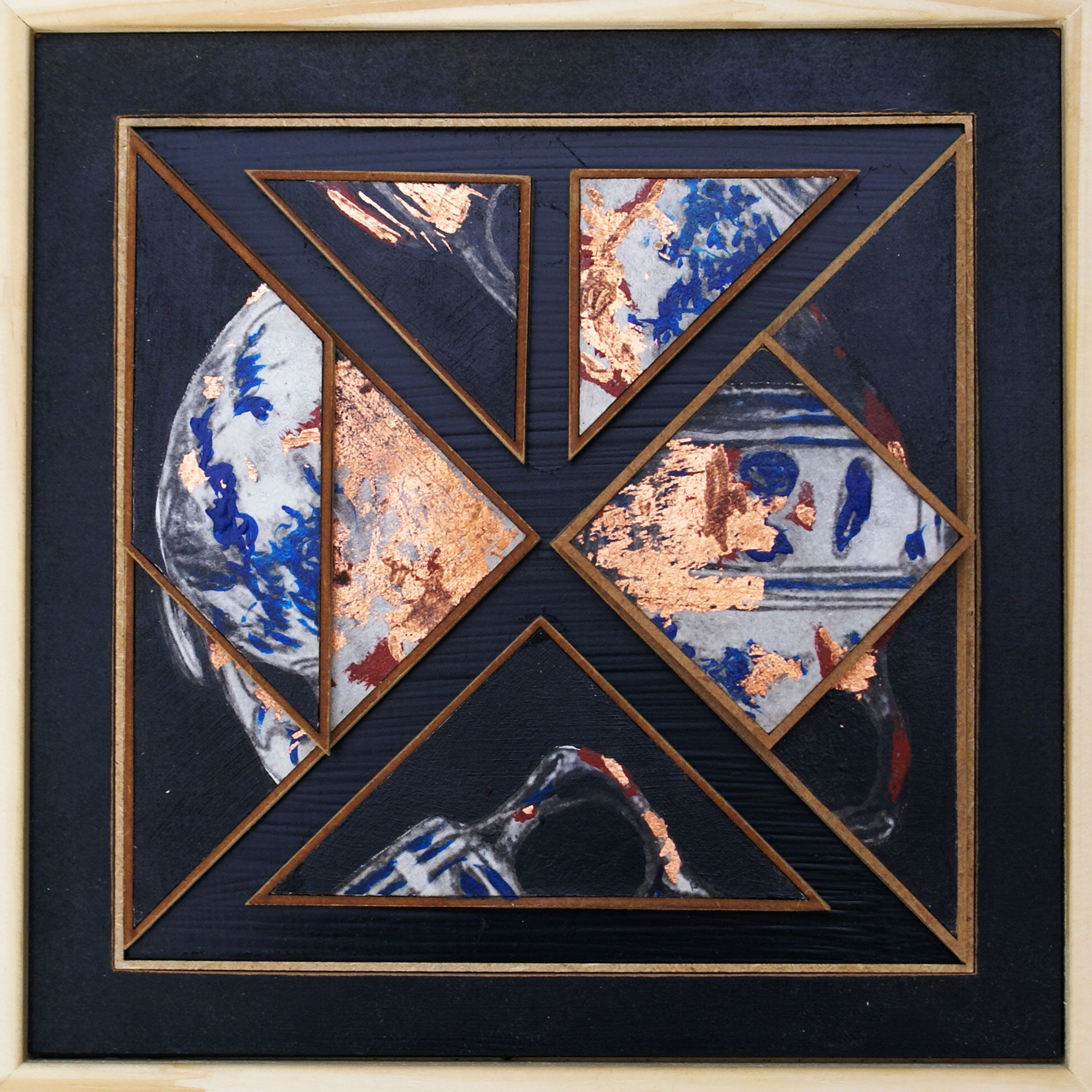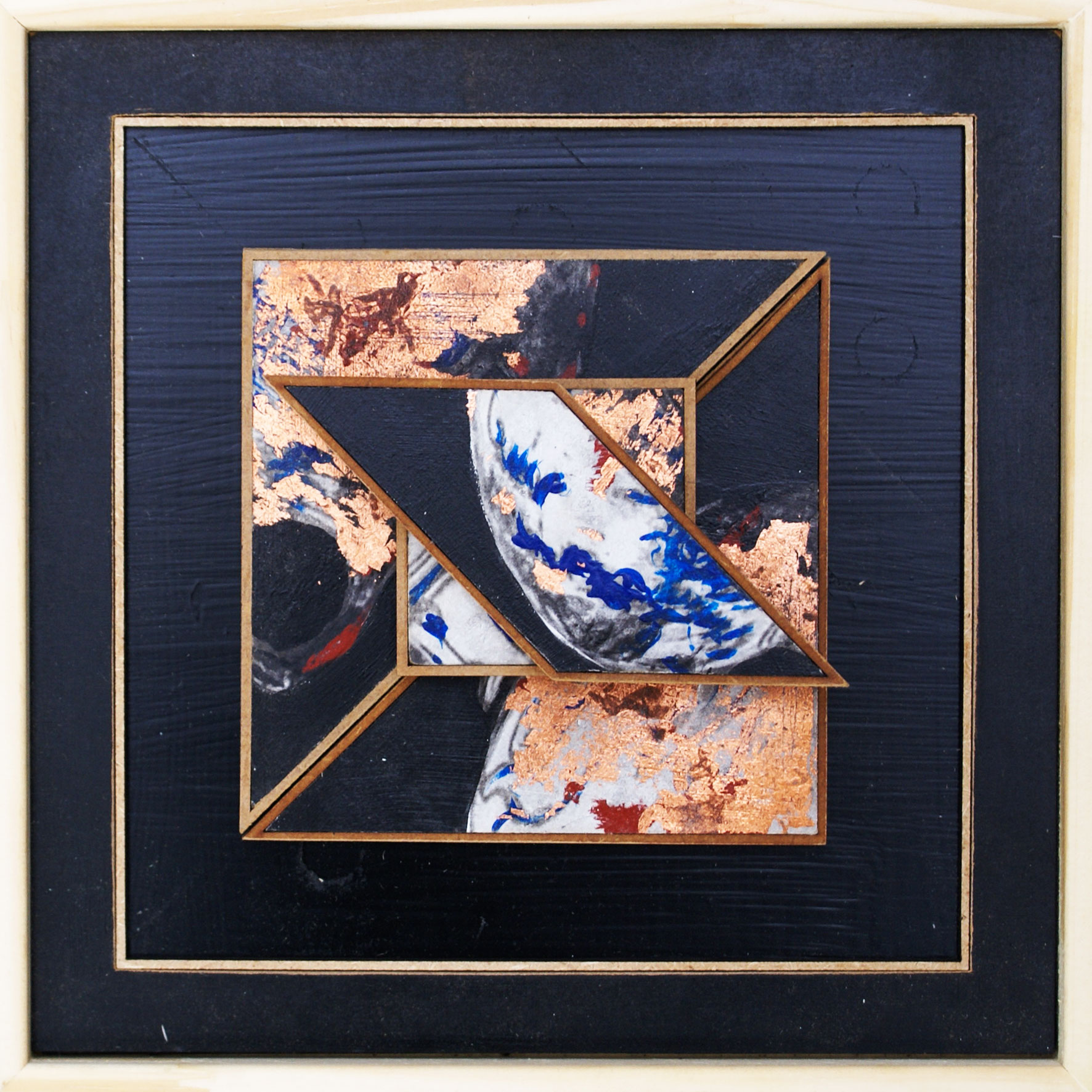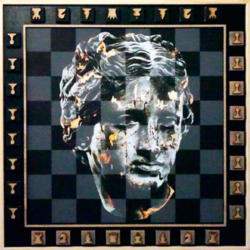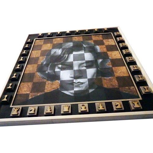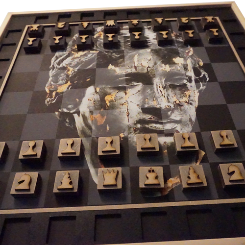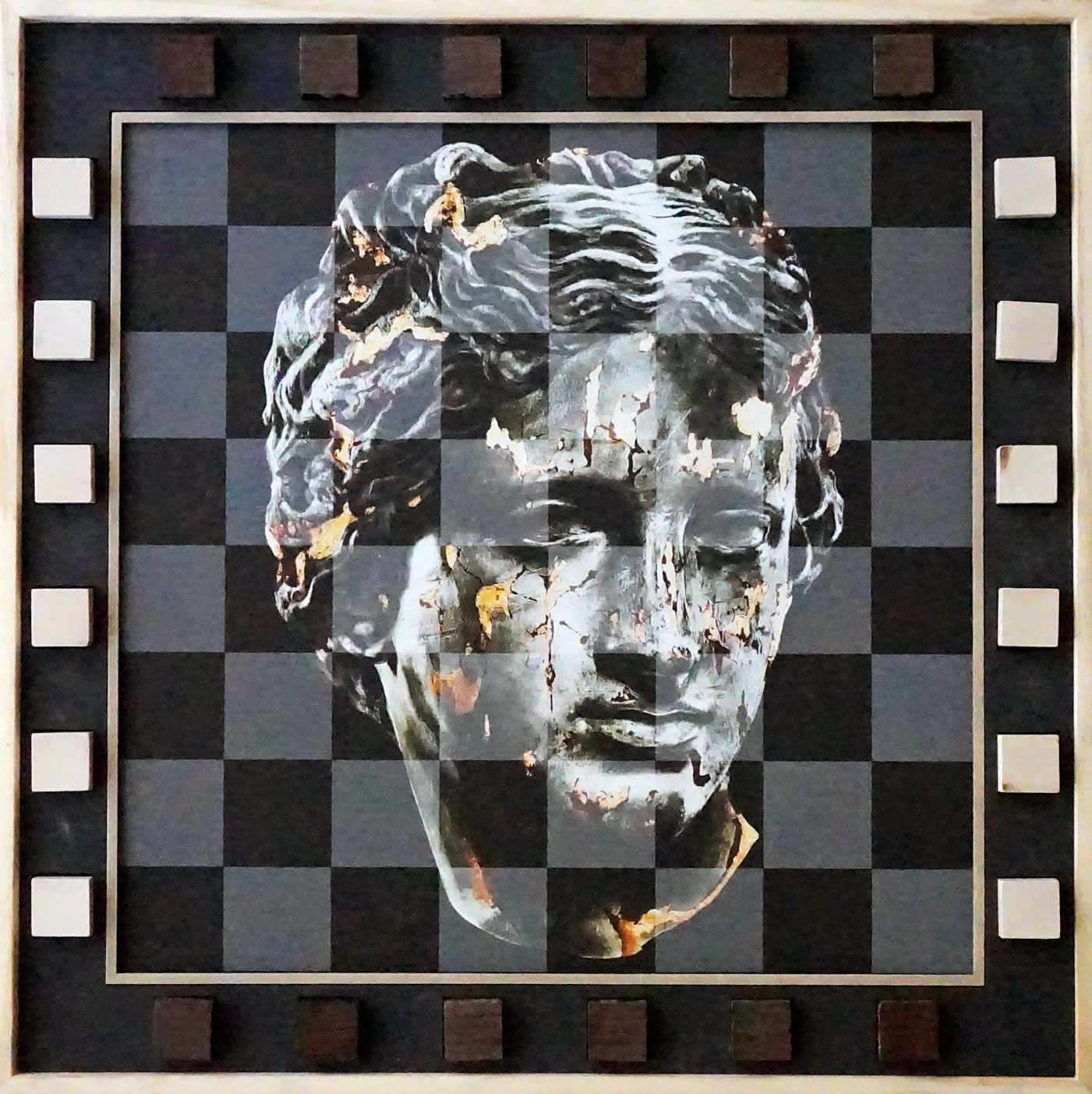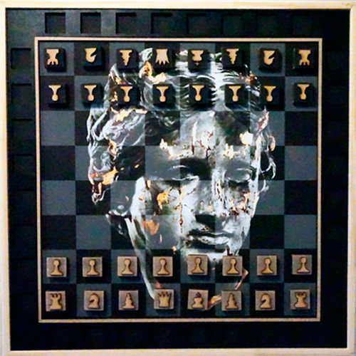 Impresión digital en lienzo magnetizado de obra original intervenida. Obra gráfica interactiva de 45×45 cm + 32 piezas móviles realizadas a mano de madera de wengué y sicomoro adheridas magnéticamente simulando las piezas del juego de ajedrez que se pueden disponer en el tablero, de forma interactiva. Tirada: 100 ejemplares numerados y firmados. Marco Infinity magnetizado 3 cm grosor. Incluye accesorio fijación magnética