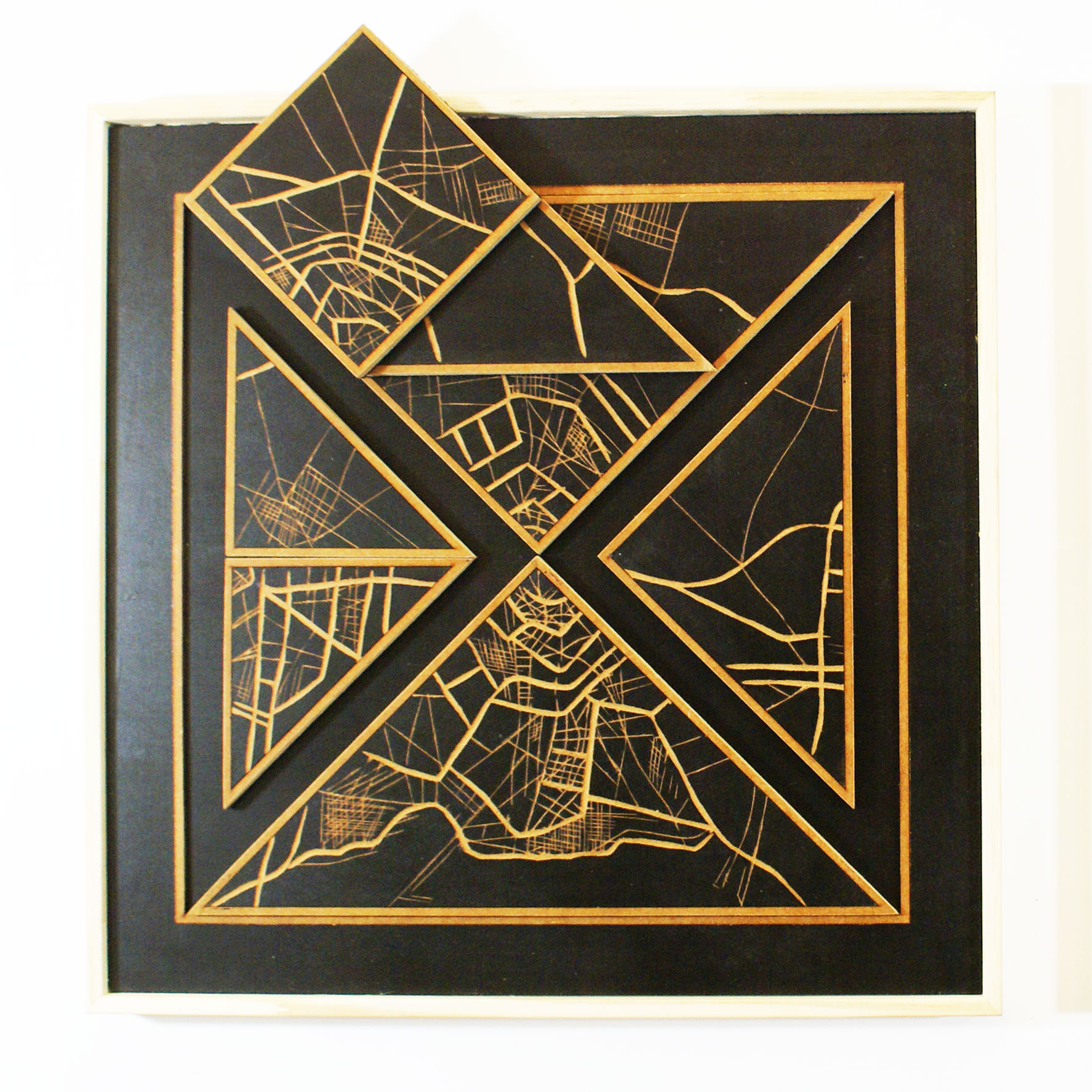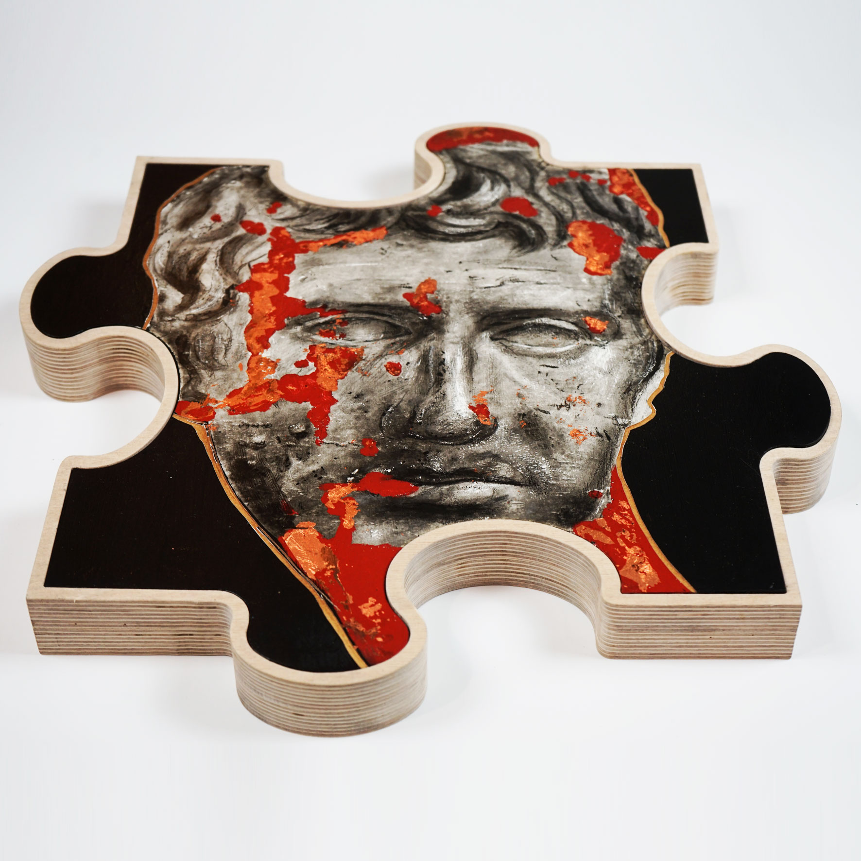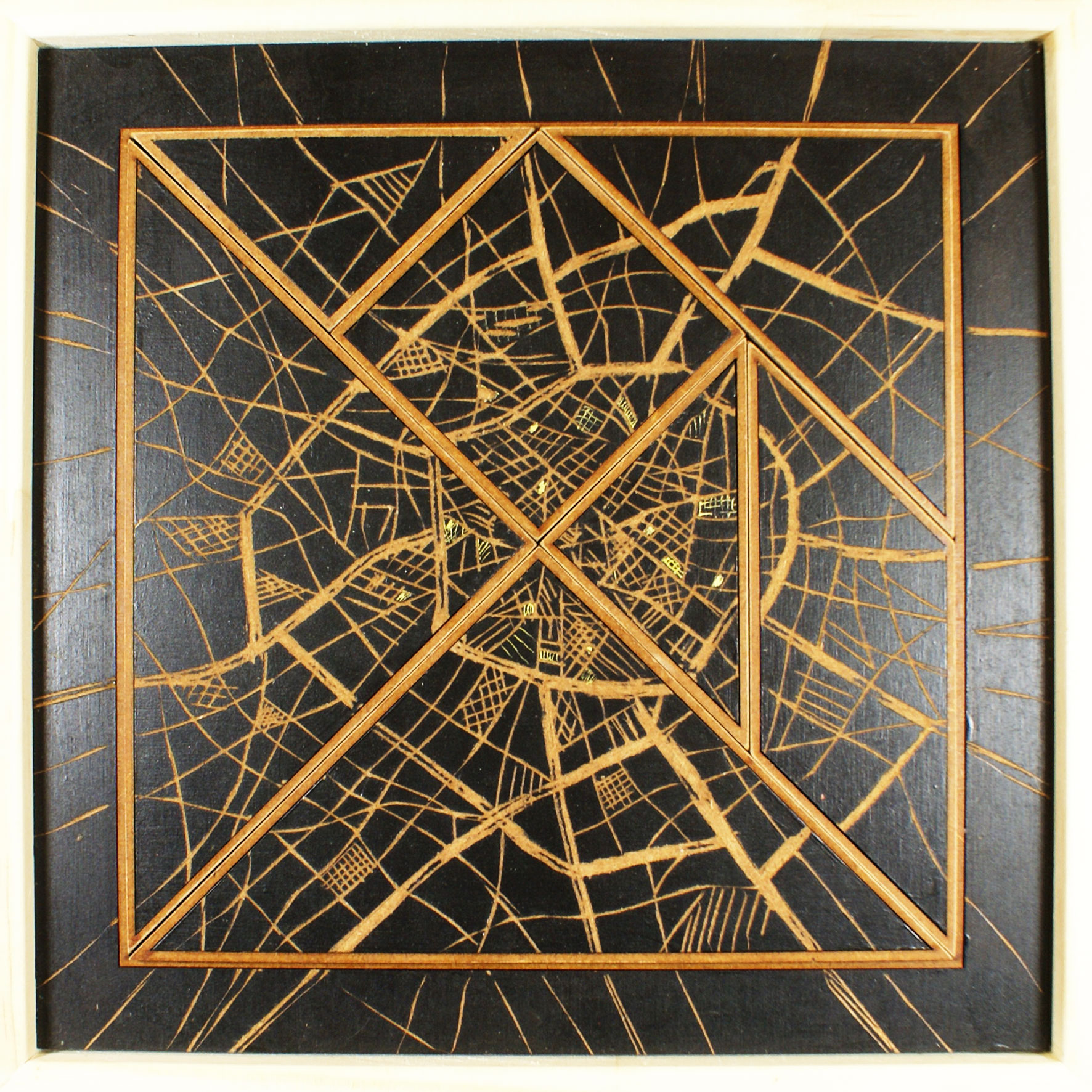 Impresión digital en lienzo magnetizado de obra original intervenida. Obra gráfica interactiva de 45×45 cm + 32 piezas móviles realizadas a mano de madera de wengué y sicomoro adheridas magnéticamente simulando las piezas del juego de ajedrez que se pueden disponer en el tablero, de forma interactiva. Tirada: 100 ejemplares numerados y firmados. Marco Infinity magnetizado 3 cm grosor. Incluye accesorio fijación magnética