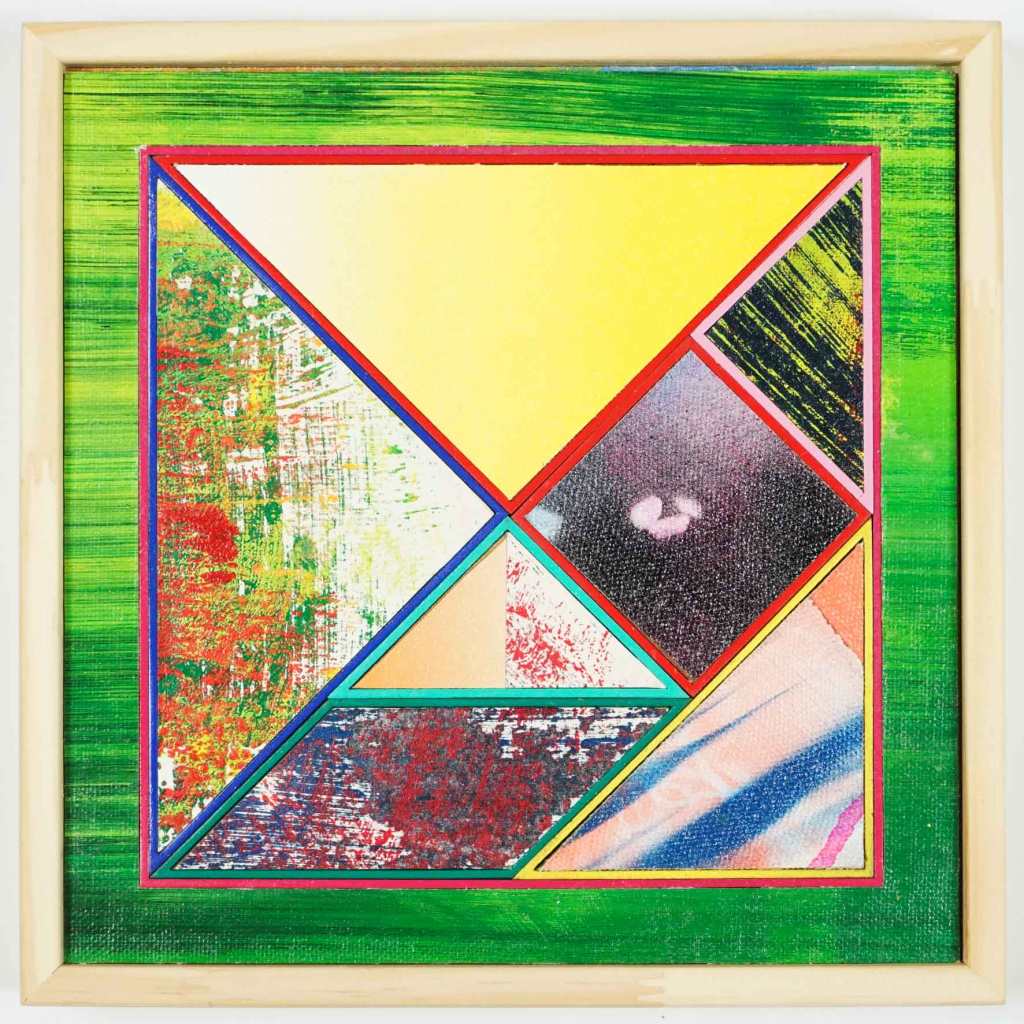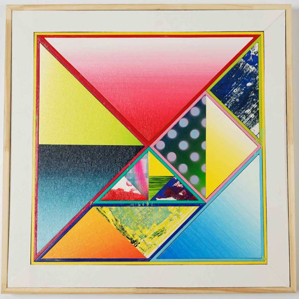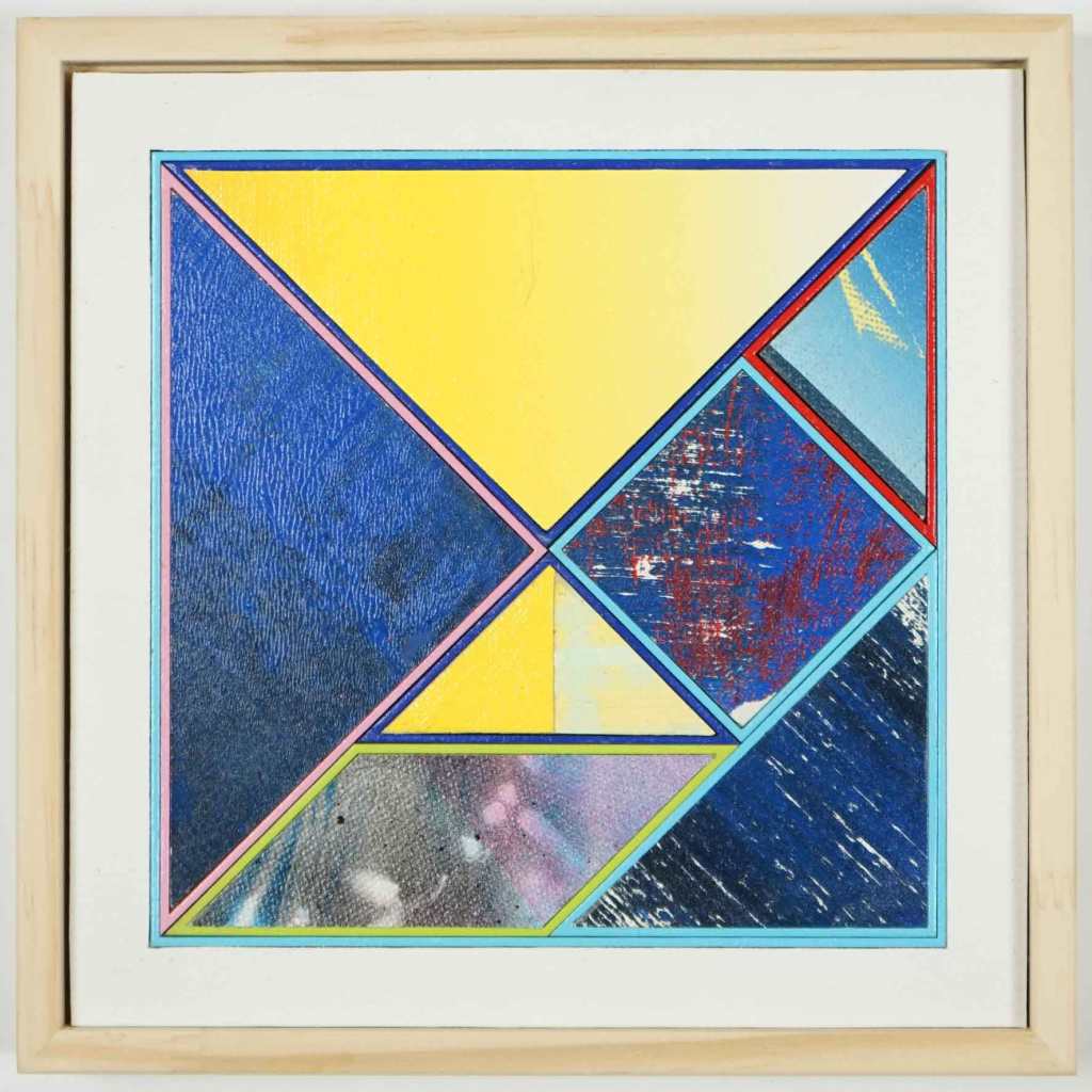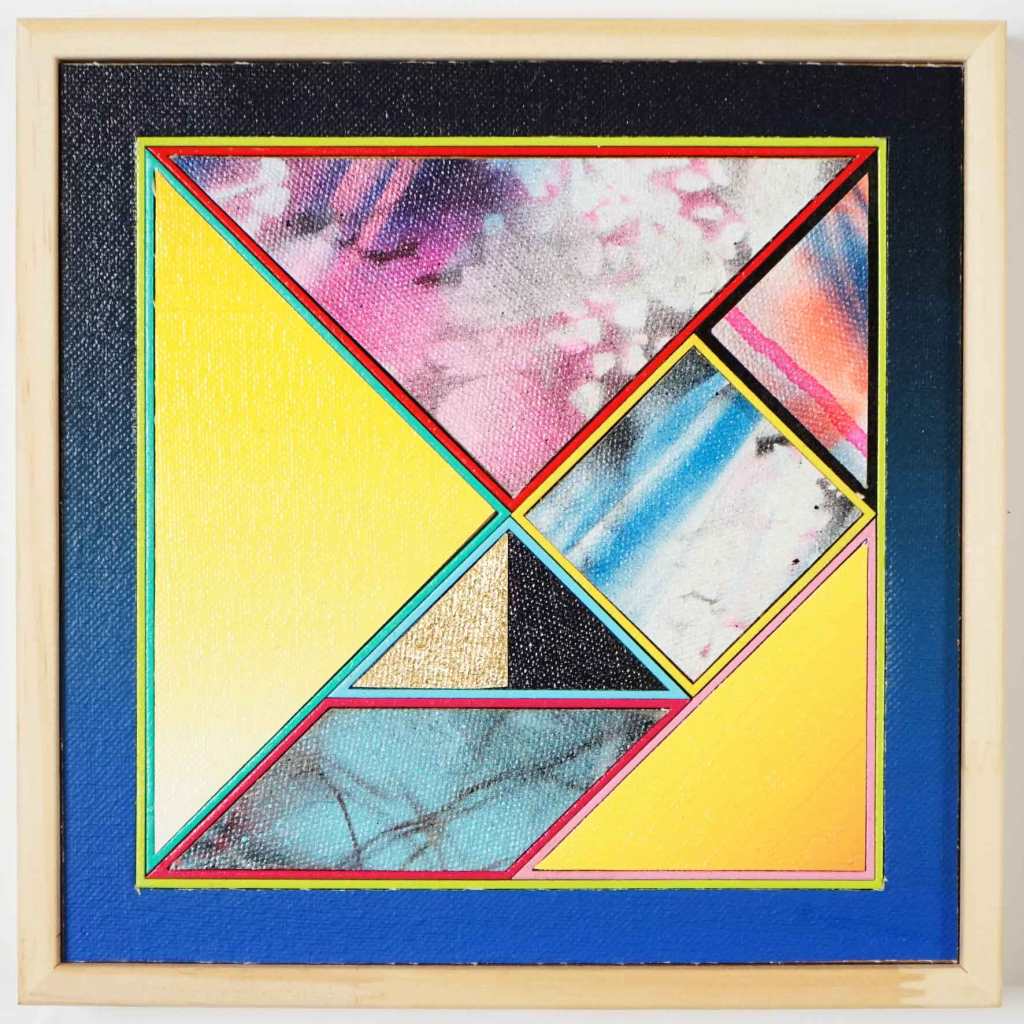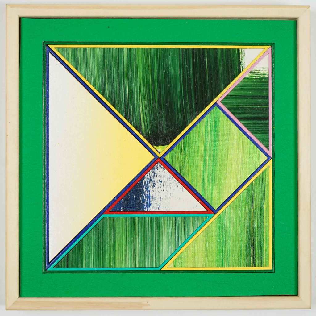 Colección de Tangrams interactivos. Pintados en dos planos. Estas obras contienen 7 elementos moviles magnetizados que se pueden disponer ad hoc dentro o fuera de la obra creando infinitas composiciones geométricas.