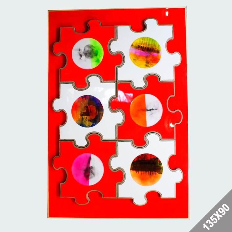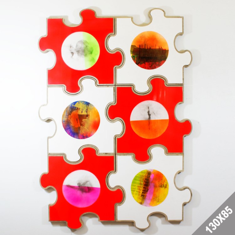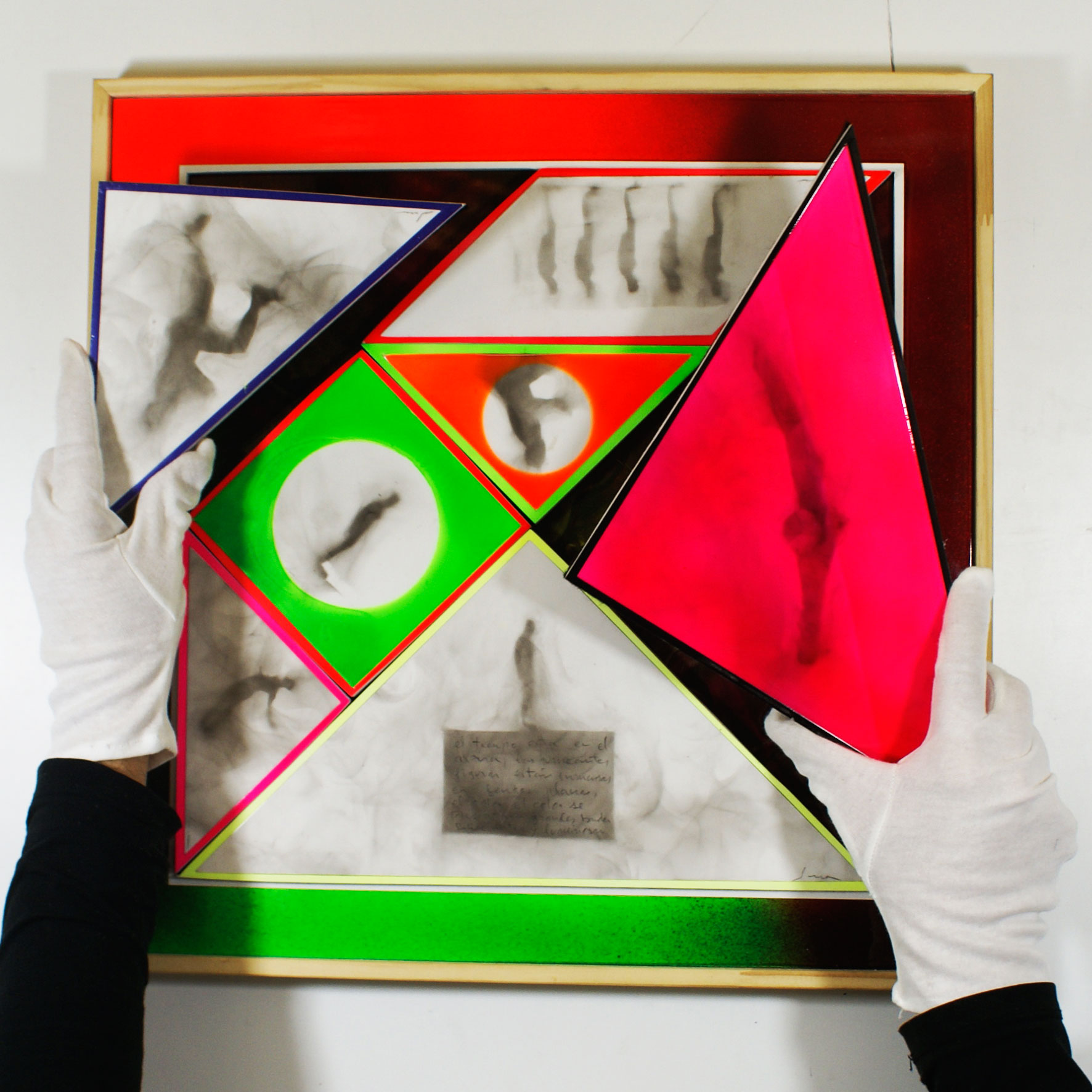 Obra única pintada con técnica ‘fumage’ sobre 6 piezas independientes magnetizadas de 45×45 cm cada una, y enmarcadas en marcos de madera tallada Infinity de 3 cm de grosor. Incluye marco/orla y accesorios de fijación magnética. Las posibilidades de exposición e instalación que ofrece esta obra son infinitas.