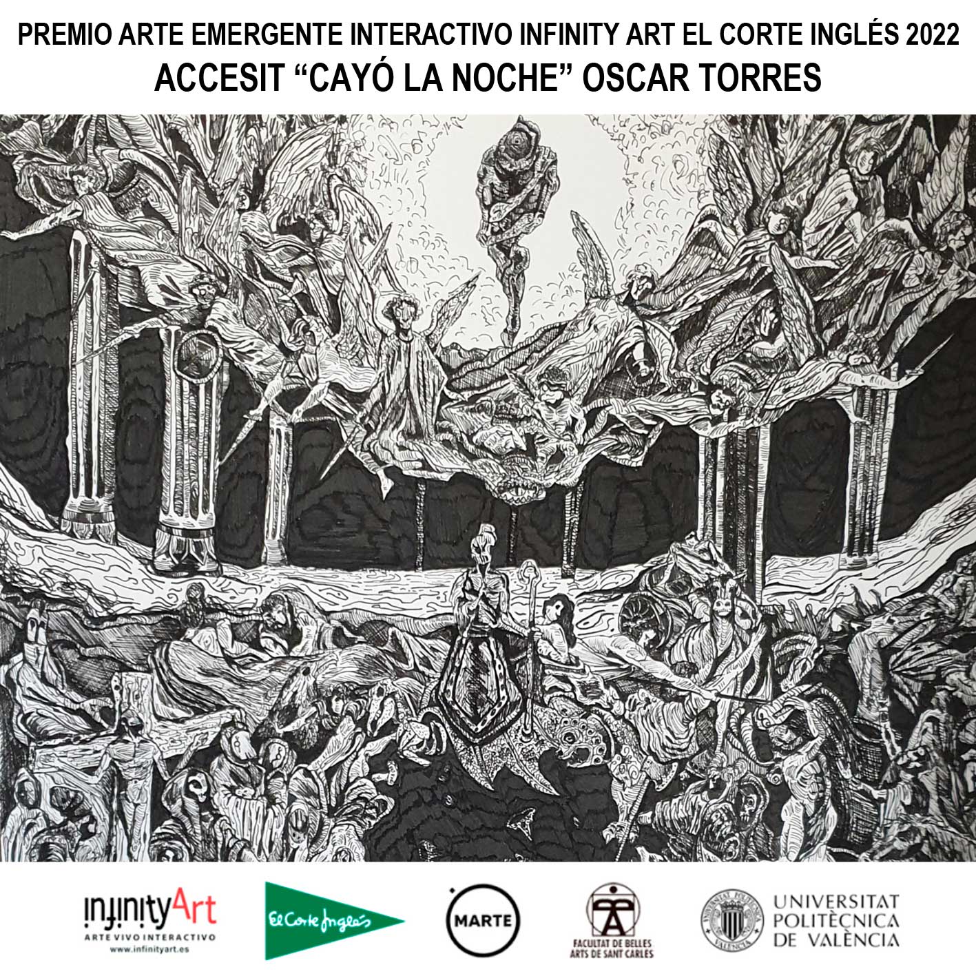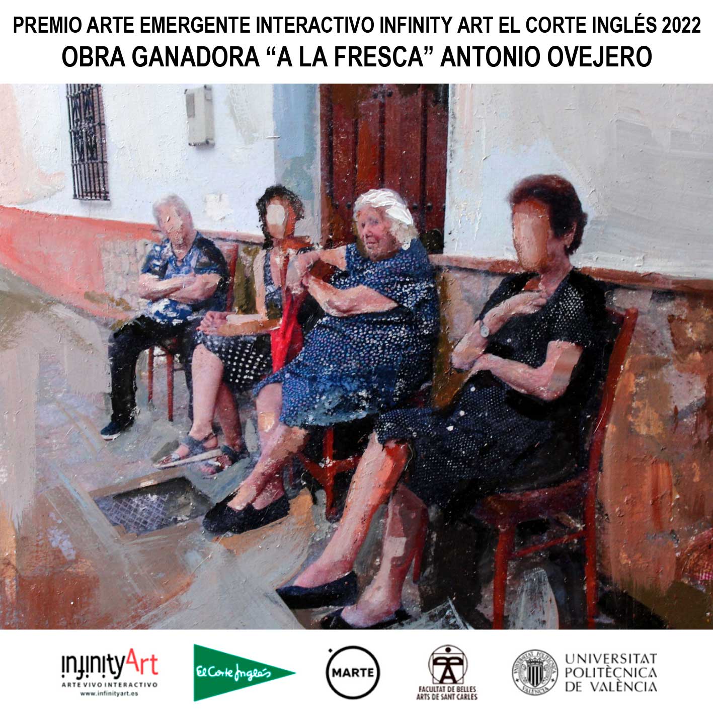El joven pintor valenciano, Antonio Ovejero ha sido el ganador del Premio Arte Emergente Interactivo El Corte Inglés Infinity Art 2022, por su obra titulada “A la fresca” dotado con un trofeo, una exposición individual en la sala de exposiciones de El Corte Inglés [Colón – 5ª Planta], y participación expositiva en la Feria Marte de Arte Contemporáneo de Castellón 2022. También se han entregado accésits a los artistas Oscar Torres por la obra “Cayó la noche” y Patricia Soto Molina por la obra digital NFT “Absence”.
