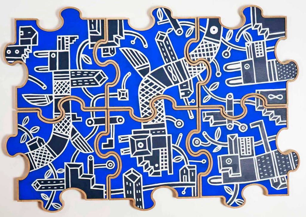 Obra única creada sobre 6 piezas independientes, moviles y magnetizadas, de 26×26 cm. cada una, y enmarcadas en marcos de madera marina de 2 cm de grosor. Incluye accesorio de fijación magnética.