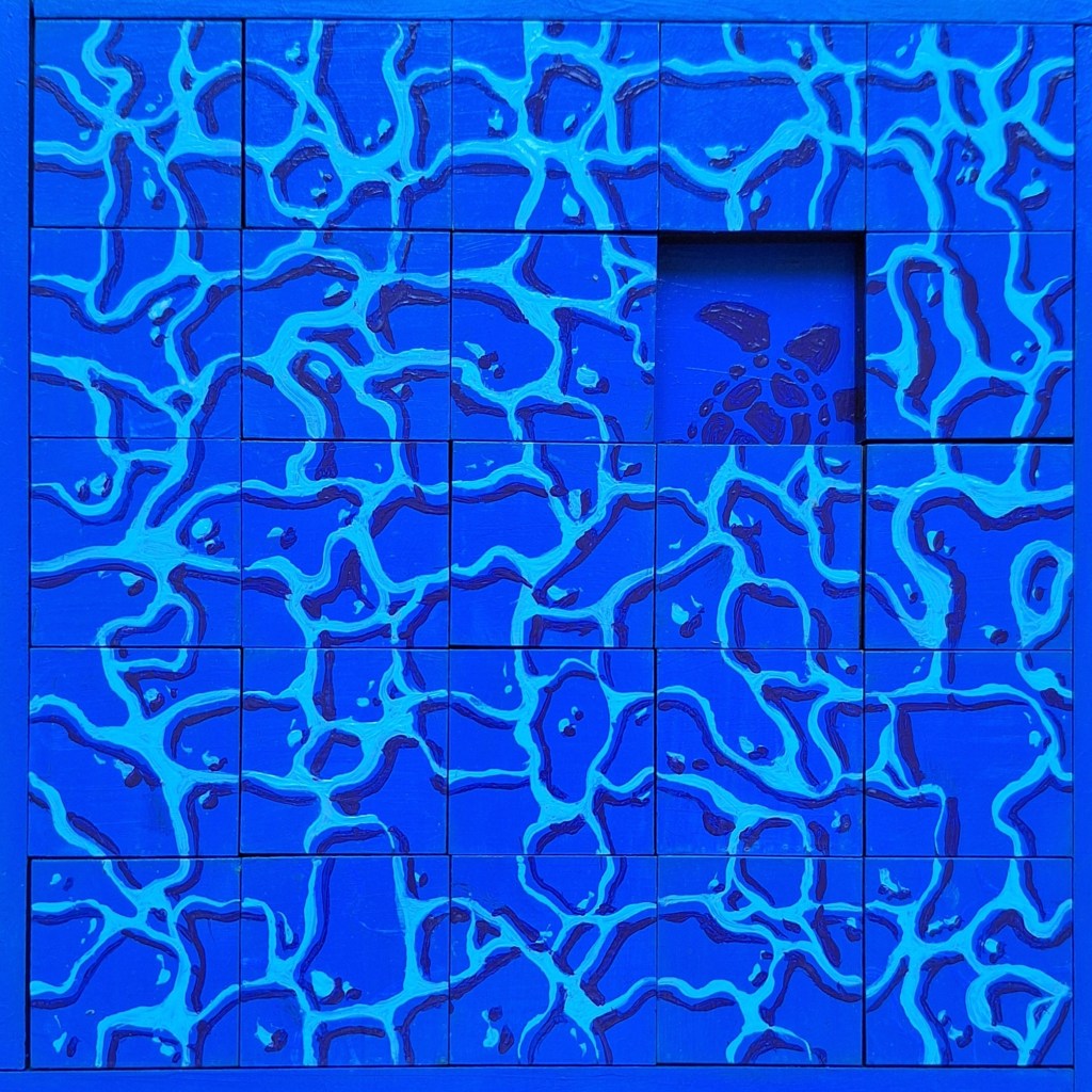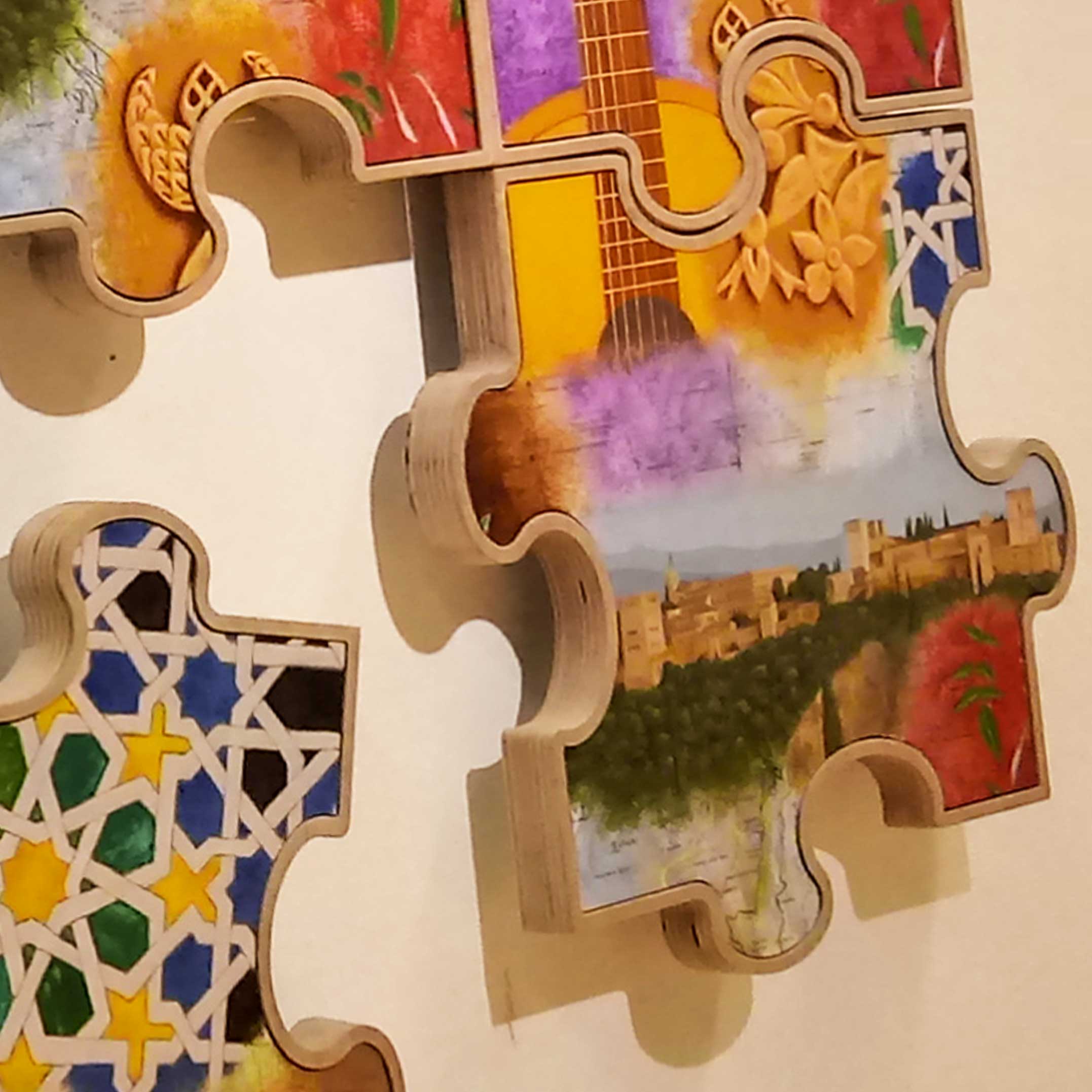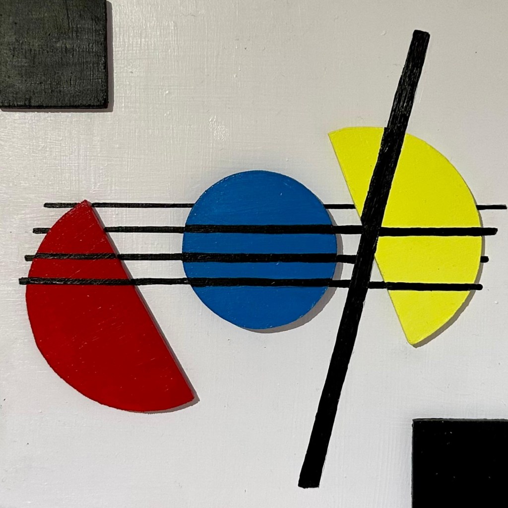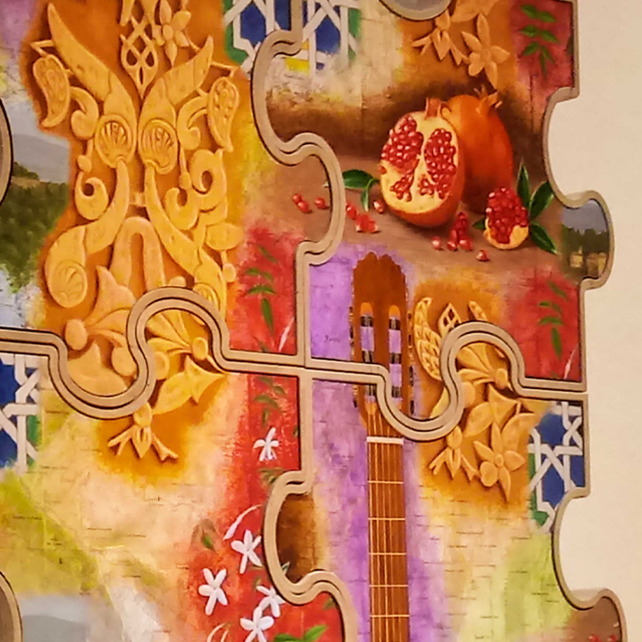 Esta pieza está inspirada en el juego “tres en raya. La imagen simula una abstracción de una guitarra tradicional de jazz, y está pintada mezclando influencias estilisticas de Mondrian [colores primarios], y Picasso [absrtracción-cubismo]. Las posibilidades de exposición, disposición e instalación que ofrece esta obra son infinitas. Cada pieza lleva un sistema de anclaje magnético individual, posibilitando la implicación del coleccionista que puede modificar la distribución de las piezas a su gusto.