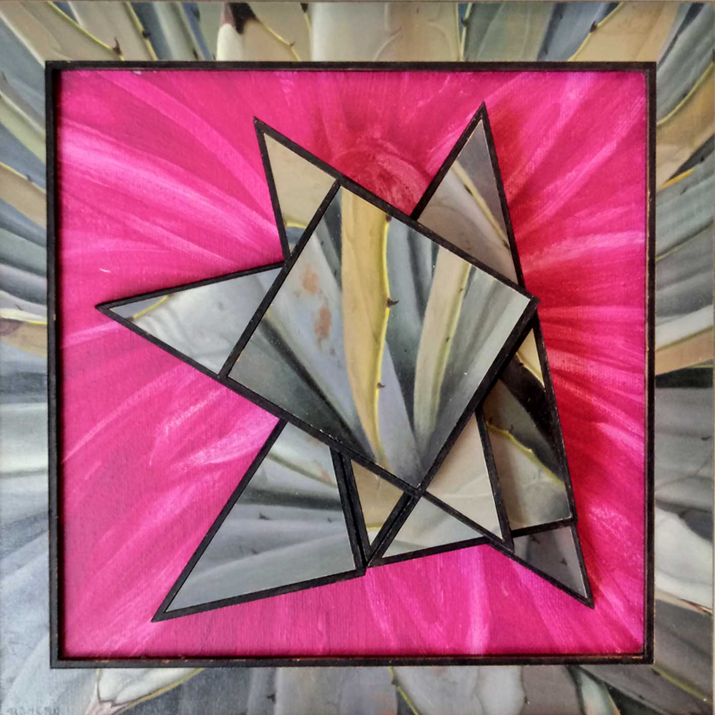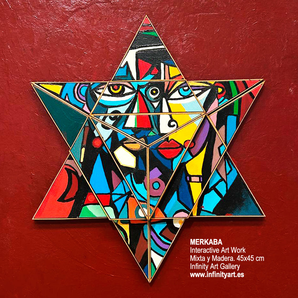 Esta pieza, representa el simbolo sagrado “Merkaba” Es una obra única inspirada en el cubismo picassiano. Pintada y mecanizada a mano sobre piezas independientes, moviles y magnetizadas. Las posibilidades de exposición, disposición e instalación que ofrece esta obra son infinitas. Cada pieza lleva un sistema de anclaje magnético individual, posibilitando la implicación del coleccionista que puede modificar la distribución de las piezas a su gusto. El símbolo Merkaba, que significa “luz, espíritu y cuerpo”, es una figura geométrica sagrada compuesta por dos tetraedros entrelazados que se giran en direcciones opuestas, creando un campo de energía tridimensional. Representa la unión del espíritu y el cuerpo, la integración de energías masculinas y femeninas, y la conexión entre el cielo y la tierra.