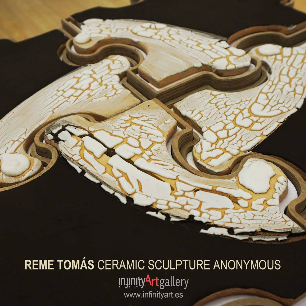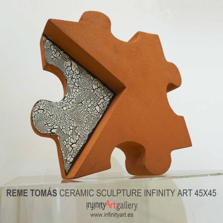A partir de la forma que identifica las piezas de Infinity Art, Reme Tomás aporta su visión tridimensional incorporándole texturas características de su obra propia, vidriados craquelados que nos remiten a la naturaleza como única dirección para conservar nuestro medioambiente.