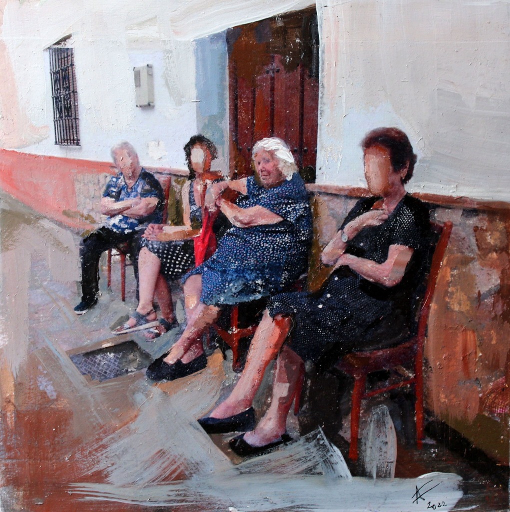 “Señoras” es un proyecto pictórico que nace de la escena cotidiana, con un contexto temporal centrado en la segunda mitad del siglo XX. El conjunto de obras de esta exposición tiene como eje principal la figura de las mujeres de avanzada edad que sufrieron de primera mano la vivencia de una España en blanco y negro, marcada por la postguerra y la dictadura franquista.
