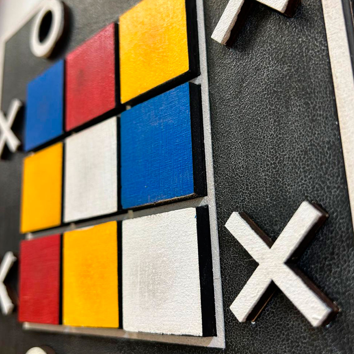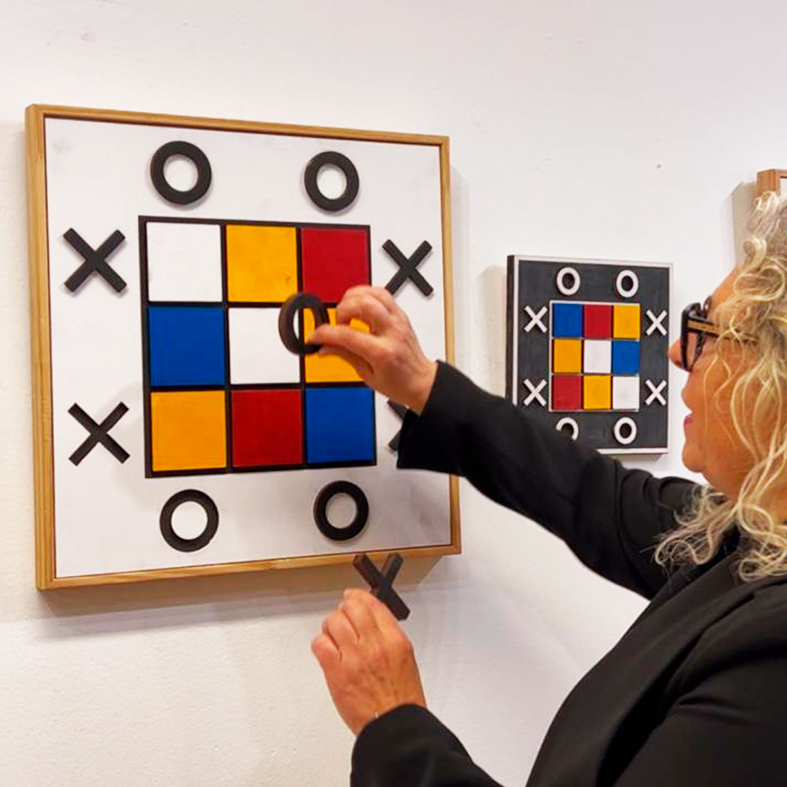 Estas piezas, inspiradas en el juego “tres en raya” celebran la obra de Piet Mondrian, creador del neoplasticismo. Este movimiento constructivista se centró en la reducción de la pintura a sus elementos básicos: líneas rectas, rectángulos y colores primarios. Las posibilidades de exposición, disposición e instalación que ofrece esta obra son infinitas. Cada pieza lleva un sistema de anclaje magnético individual, posibilitando la implicación del coleccionista que puede modificar la distribución de las piezas a su gusto.