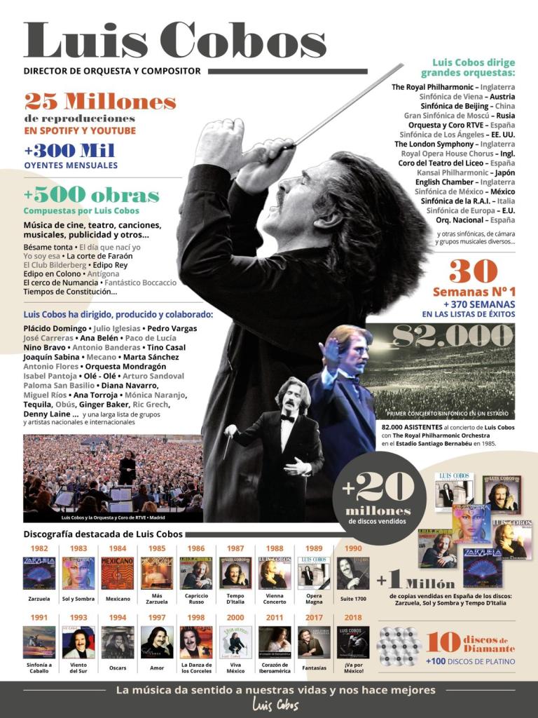 Luis Cobos es. Ha compuesto música orquestal, bandas sonoras para cine, teatro clásico, televisión, canciones, música electrónica… y ha dirigido a las grandes orquestas del mundo: The Royal Philharmonic Orchestra, London Symphony, Sinfónica de Moscú, Sinfónica de Viena, Sinfónica de Beijing, Sinfónica de Europa, Sinfónica R.A.l. de Italia, Sinfónica de Los Ángeles y otras muchas orquestas, bandas y coros. Como director musical, arreglista y productor, Luis Cobos ha trabajado con artistas y grupos variados y de importancia: Julio iglesias, José Carreras, Mecano, Joaquín Sabina, Plácido Domingo, Antonio Banderas…. Tiene en su haber multitud de discos de oro y platino y diez discos de diamante por las ventas de sus discos que se editan en todo el mundo y superan la cantidad de veinte millones de ejemplares vendidos. Luis Cobos es presidente de la Sociedad de Artistas de España AIE, de la Federación Iberoamericana de Artistas FILAIE, y del Consejo de la Fundación Cultural Latin GRAMMY. Presidente del Grupo Internacional de Artistas GIART, presidente de la Academia de la Música de España, y ex presidente de la Academia Latina de la Grabación (Latin GRAMMY).