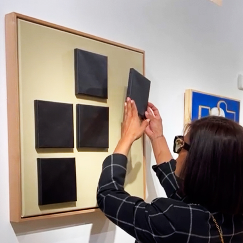 Obra modular única e interactiva pintada en dos planos al óleo, sobre madera y chapa, con 7 elementos móviles. Enmarcada en marco Infinity de 3 cm de grosor. Incluye accesorios de fijación magnética. Las posibilidades de exposición, disposición e instalación que ofrece esta obra son infinitas.